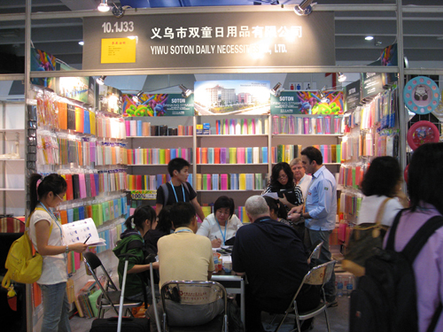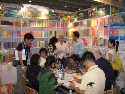 上圖為2008年廣(guǎng)交會中外客商在公司(sī)展位上洽(qià)談訂單合作(zuò)事宜