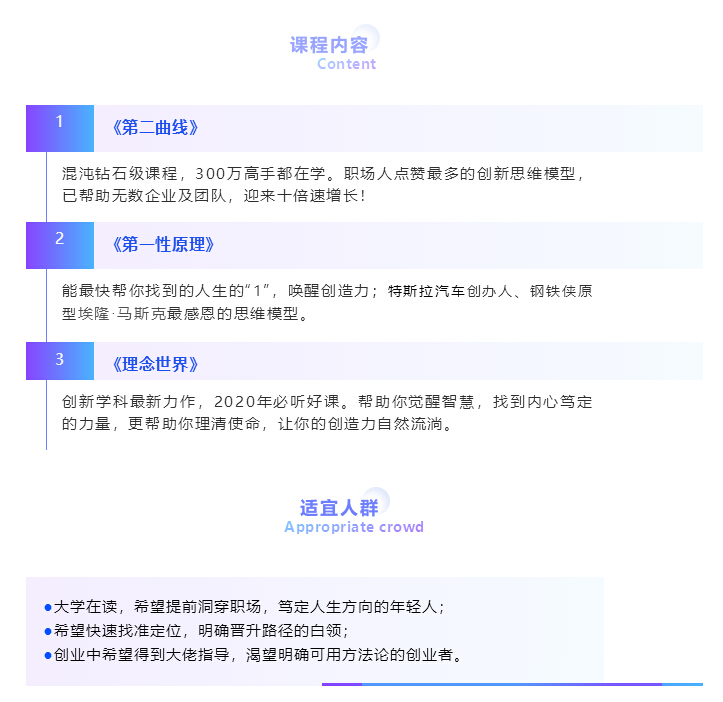 看到這裏(lǐ),相信(xìn)你(nǐ)已經對這些課(kè)程有(yǒu)了一定的了解,如果你是這些人群當中的(de)一員,如果你(nǐ)想有所改變,那就趕快掃碼體驗吧!300萬創新者邀你同行,找到“1”,一秒看清本質,即刻開掛。