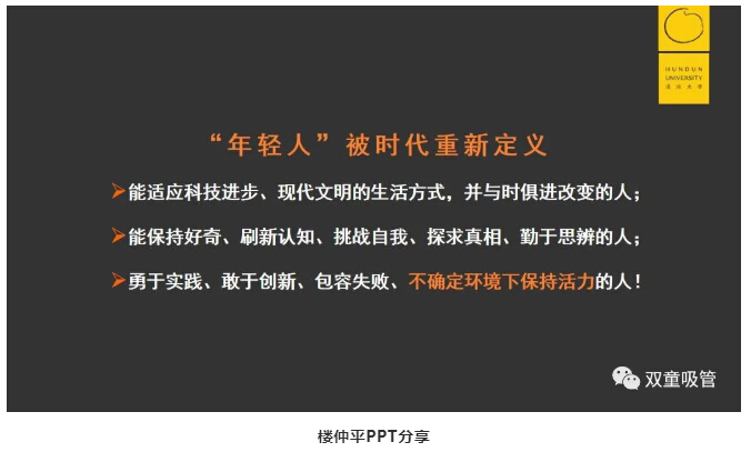 所以(yǐ),這些年來,樓仲平一直(zhí)堅(jiān)持向(xiàng)年輕人學習(xí),創建與年(nián)輕(qīng)人對話和(hé)溝(gōu)通的能力(lì),永(yǒng)遠將自己定位在25歲,緊(jǐn)追時(shí)代步伐,不讓自己成為(wéi)時代的“棄兒”!
