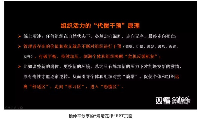 而避免(miǎn)“熵增”的唯一方(fāng)法就是管理者持續開放和組織幹預,從而打破平衡,持續加壓、刺激個體和組織(zhī)喚醒“危機反饋機製”,從而讓個體和組織遠離“舒適區”,走向“學習區”,進入“恐慌區”,原有惰(duò)性才能逐漸逆轉,從而煥發出新的活(huó)力(lì)!