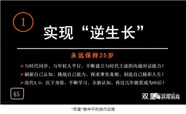 所以,“雙(shuāng)童”樓仲平這十五年來努力使自己(jǐ)脫離原(yuán)有圈子,進入年輕群體的圈子,並且一直將(jiāng)自己(jǐ)定位在(zài)“25”歲!因為(wéi)年輕(qīng),才會不斷學習去(qù)認知世界;因為年輕,才可能與年輕人為伍而保持激情;因為年輕,才能去擁抱這個高速變化的世界而更新迭(dié)代(dài)!