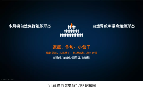 其中,樓仲平重點通過幾幅思維邏輯圖PPT,展現了在不同組(zǔ)織關係下的企業(yè)發展形態。從最原始的“小規模自然(rán)集群組織”邏輯圖上,我們能發現這種“雙層級”形式在規模較小時,編製靈活,人員精幹,機(jī)動(dòng)快速,戰鬥力強(qiáng),是十分高效的組織形態。但當規模不斷擴張下,非常容易導致管理混亂(luàn)的情況。