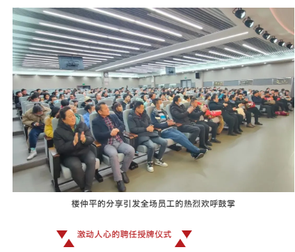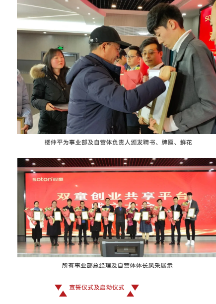接下來,就是激動人心的聘任授牌(pái)儀式環節。所有事業部及自(zì)營體的負責人依次上台,從樓仲平手中接過代表著責(zé)任和擔當的聘任證書、榮譽牌匾及鮮花!