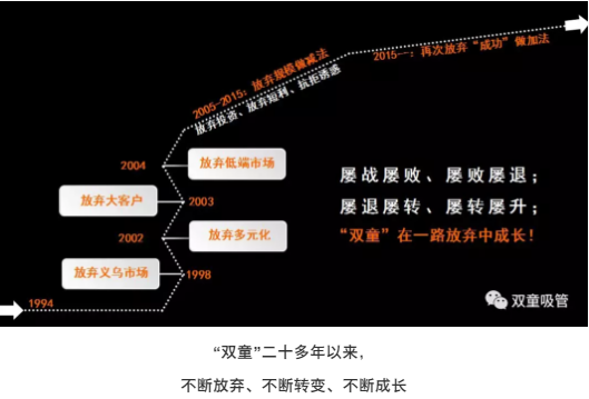 2003年,“雙(shuāng)童”放棄了多元經營,放棄了低價(jià)貼牌加工的(de)“大客戶”,提出了(le)“兩條腿走路”和“小客戶原則”;
