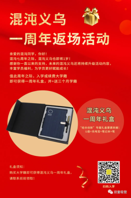 在混沌義烏即將成立(lì)一周(zhōu)年之際,混沌義烏也(yě)做了一個返場活動,如果大家有意向加入(rù)混沌,歡迎掃碼了解更多谘詢。