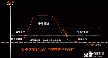 從上述模型中,我們能夠看到人類從幼少年階段開始,經過青年階段,到達中年階段,這期間的成長過程中,人類的(de)認知水平隨著年齡增長而不斷提升,並在中年階段到達巔峰期。