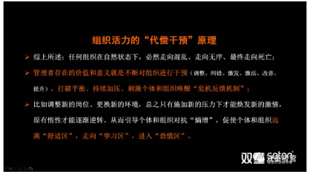 而(ér)避免“熵增”的唯一方法就(jiù)是管理者持續(xù)開放和組織幹預,從而打破平衡,持續加壓、刺激個體和組織喚醒“危機反饋機製”,從而讓個體和組織遠離“舒適區”,走向“學習區”,進入“恐(kǒng)慌區”,原有惰(duò)性才能逐漸逆轉,從而煥發出新的活力(lì)!