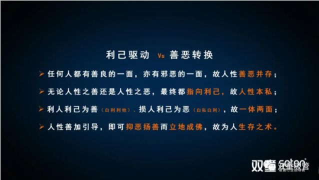 從上圖中大家可以看到(dào),無論人性之善還是人性之惡,其實都包含“利己驅動”。“利己”是人在長期的自然環(huán)境中為了獲得(dé)生存不得不獲得更多外部資源的內在驅動力,從而導致人總是會從(cóng)利己的角度去考慮如何更(gèng)快、更多(duō)的獲得。所以“人性本私”是無可非議的。