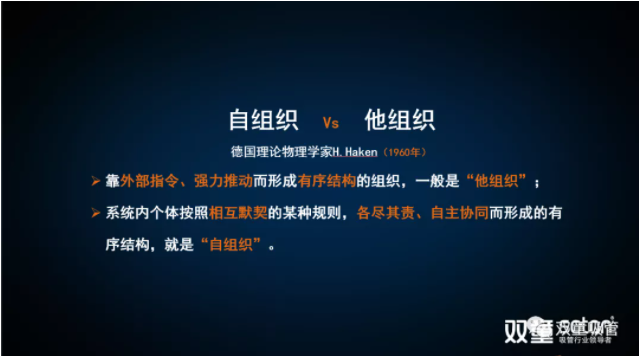樓老師的分享先給出了答案(àn):“雙(shuāng)童(tóng)”從2016年之後組(zǔ)織變革的方向(xiàng)是“回歸自組織”:通過組織結構的設計,讓核心成員對自己所處的工作認知(zhī)從“他組織”(他的組織)轉變到“自組織”(我的組織)。