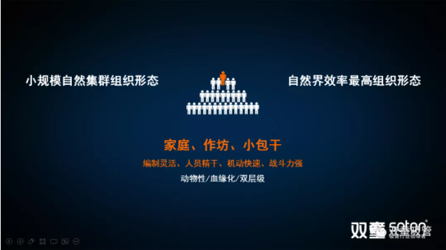 樓老師通過蟻群、猴群、魚群等自然界(jiè)案例和思維邏(luó)輯圖,向大(dà)家展(zhǎn)現了(le)自然界當中普(pǔ)遍存在的(de)自然(rán)組織形態。這(zhè)種(zhǒng)基於動物性、血緣化本能而形成的雙層結構的組織形式由於其編(biān)製靈活、人員精幹、機動快速(sù)而戰鬥力強,是自然界當(dāng)中存在億萬年之久的(de)十分(fèn)高效的組織形態。