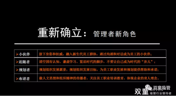 最後樓老師針對上(shàng)述組織變革提出了管理(lǐ)者角色的重新定位,他認為傳統經營者和管理者如果還在堅持沿用以前的老經驗、老方式,那(nà)就離淘汰不遠了!樓老師也再次提(tí)醒大家,麵對不同(tóng)的(de)價值(zhí)個體,管(guǎn)理者首先需要改變(biàn)的就是自己: