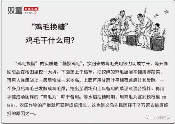 現在很多年輕人都搞不明(míng)白,為什麽當時義烏人要拿(ná)“雞毛”去換(huàn)糖?這個“雞毛”有什麽用? 其實,雞毛的(de)用處還是挺多的! 14歲小貨郎挑貨郎擔
