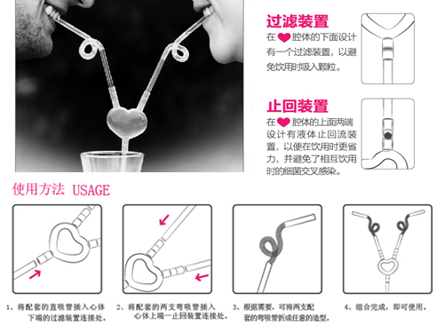 ● 全新設計(jì)“水流(liú)止回裝置”,解決(jué)了傳統愛(ài)心吸管必須同步飲用(yòng)的尷尬;
