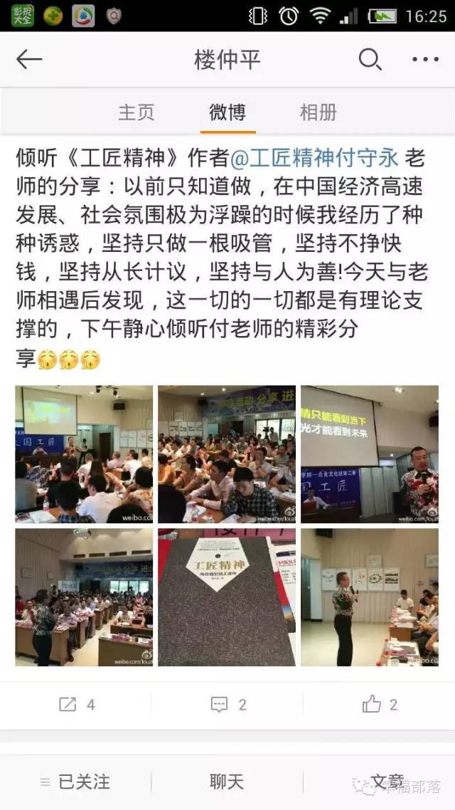看,樓總在(zài)課程中(zhōng)在微(wēi)博上分享:以前隻知道做,在中國經濟高速發展,社會氛圍極為浮躁的時候我經曆了種種(zhǒng)誘惑,堅持(chí)隻做(zuò)一根吸管(guǎn),堅(jiān)持不掙快錢、堅持從長計議、堅持(chí)與人為(wéi)善,今日與付(fù)老師相(xiàng)遇後才發現,這一切都是有理論支撐的。盡心傾聽付老(lǎo)師帶來《工匠精神》的精彩分(fèn)享(xiǎng)。