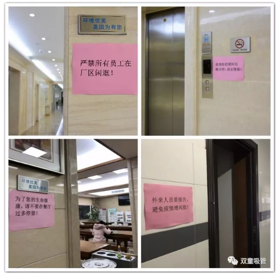 在廠區(qū)內部,所有公共區域都貼上了防疫宣傳(chuán)標語並公示公(gōng)司疫情防控公告。通過這些言簡意賅的宣傳(chuán)標語,讓全體員工參與到防疫工(gōng)作中(zhōng),提高了員工自律(lǜ)、自我防護、自我管理的(de)意識與能力,在內部形成(chéng)濃厚的疫情防控氛圍。