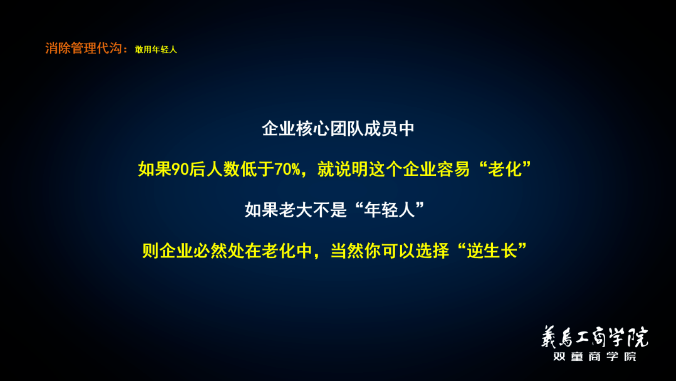樓仲平曾在(zài).17c嫩嫩草色视频商學院的用人觀課堂上說過這樣一句話:“如果90後少於70%,說明你的企業容易(yì)老化!”,企業沒有年輕人就沒有新鮮活力,創造性就容易降低。