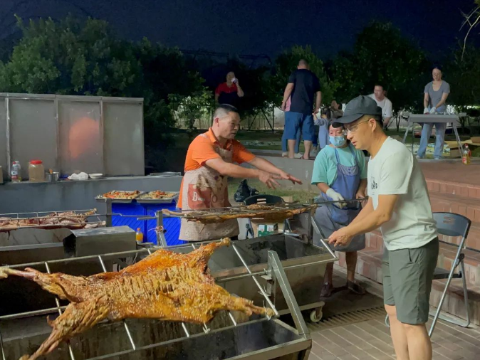 秋意漸起,微風習習,但大家聚在一起,燃燒的火焰和沸騰的熱血讓整個氣氛依舊火熱!樓總還大展身手烤起了烤全羊,加上孜然美滋滋的!火焰“飛舞”,肉香四溢,專業範兒十足!
