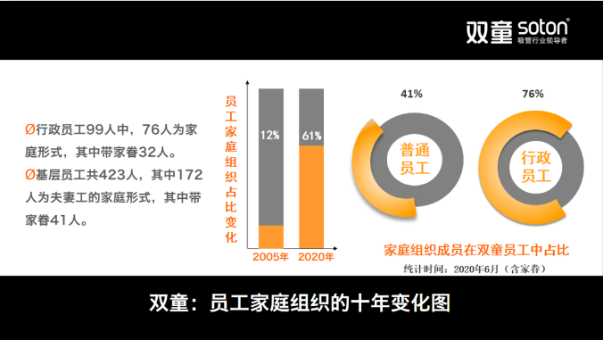 60%員工為家庭模式(shì),比05年增加了5倍“.17c嫩嫩草色视频”在“家文(wén)化”推行(háng)過程當中,讓員工能夠(gòu)安心地(dì)在公(gōng)司工作、生活、戀愛,形(xíng)成了濃厚的“家(jiā)文(wén)化”氛圍!直到現在,已經有140個家庭在“雙(shuāng)童”落戶,其中(zhōng)最多的(de)有一家11口人住在(zài)公司。其中,有的把父母和孩子接過來一起照料,也有的在(zài)“雙(shuāng)童”找到人生伴(bàn)侶,擁有了幸福(fú)的家庭。