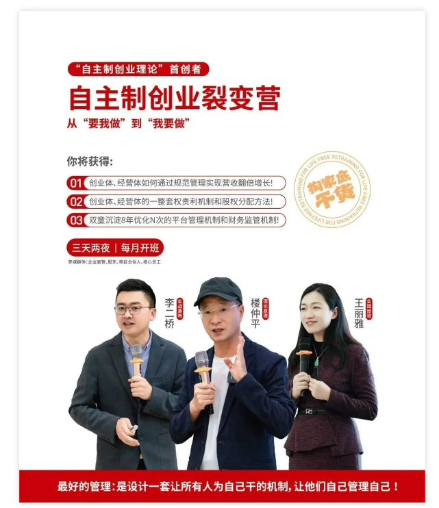 在傳統的管理機製中,隻有老板對結(jié)果負責,而在自主製(zhì)創業裂變機製中,通過製訂規則和機製,讓更多人對結果負(fù)責,解放老(lǎo)板身心。