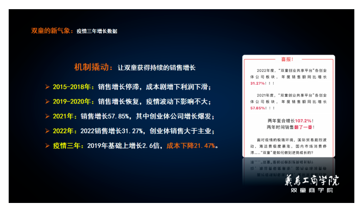 “雙(shuāng)童”設(shè)立經營體和創業體獨立經營,本質上(shàng)就是讓更多員工既對收(shōu)入(rù)負責,又對成本負責,更對結果和利(lì)潤負(fù)責。