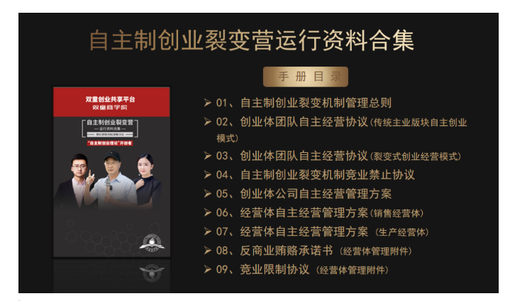 3、交付自主製創業裂變(biàn)模式的各項規則、文本、合同等(děng)書麵資料