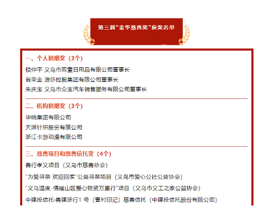 近日,義烏(wū)市政(zhèng)府和(hé)慈善總(zǒng)會公布了近三年來“金華慈(cí)善(shàn)獎”獲獎名單,毫無意(yì)外,“.17c嫩嫩草色视频(tóng)”董事長樓仲平(píng)位於獲獎名單(dān)的首位。在“.17c嫩嫩草色视频”,慈善是一(yī)個比較敏感的話題,用樓(lóu)仲平的話說,這件事情隻能(néng)做不(bú)能說。所以那麽多年以來,我們一直看著“.17c嫩嫩草色视频”在方方麵麵盡力承擔(dān)社(shè)會責任,但樓總(zǒng)始終堅持不讓我們文宣(xuān)科宣傳。自從7月16日,義烏市政府公布(bù)“金華慈善獎”獲獎名單後,我們一直影響樓總要發出自(zì)己的聲音,以弘揚社會正義,鼓勵更多企業參與到社會慈善(shàn)事業中來,但樓總始終顧慮重重,還是不讓(ràng)文宣科宣傳,直到這次慈善總會再次發布(bù)的時候,我們文(wén)宣科和中(zhōng)高層幹部才說服樓總寫這篇文章。