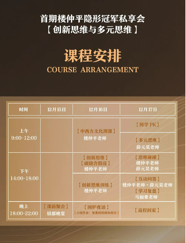 就在12月15日-17日,我們即將迎來(lái)首期《樓仲平·隱形(xíng)冠軍私享會》第二模塊的(de)學習征程(chéng),本模塊的主題是【創新思維】,關鍵詞為“破圈”!