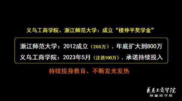 他還表(biǎo)示,好的企業一定會成為一所大學、好的經營者也(yě)一定會成為老師(shī)。樓仲平先後在浙江師(shī)範大學、義烏工(gōng)商學院(yuàn)成立“樓仲平(píng)獎學金”,並不斷增加投入資金,他(tā)將持續投身教育,不斷發光發熱!