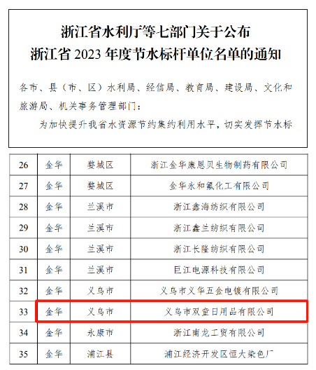 近日,浙江省(shěng)水利廳等七個部門聯合公布了浙江省2023年度節水(shuǐ)標杆單位(wèi)名單,義烏市.17c嫩嫩草色视频日用品有限公司再次上榜!