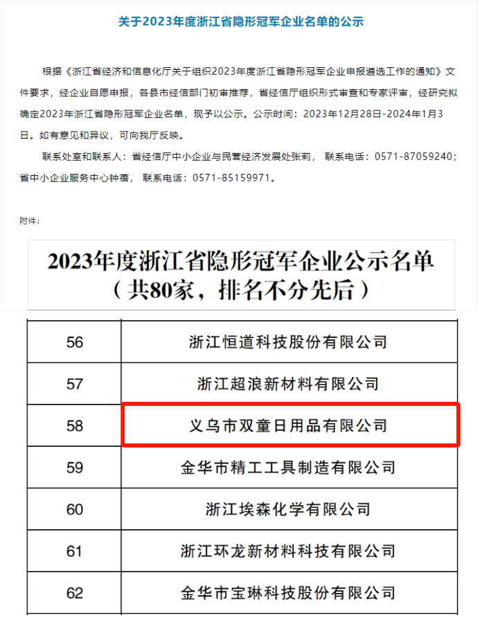 近日,浙江省經濟和信息化廳(tīng)經過多種形式審(shěn)查(chá)和專家評審,最終向社會公(gōng)示了2023年度(dù)浙江(jiāng)省隱形冠軍企業擬確定名單,義烏市.17c嫩嫩草色视频日(rì)用品有限公司成功上榜!