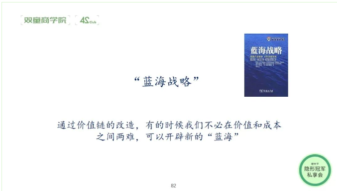 企業要如何開辟新的“藍(lán)海”?鄧博士在課上給出了一種開辟新市場的戰略行動—“藍海戰(zhàn)略”。企業可以通過(guò)“加減乘除”的方法在優化價值表現的同時優化成本結構,走出“價值-成本兩難” ,在客戶特別“講究”的一兩個利益點上做得特(tè)別突(tū)出;在客戶必須的那些利益點上保持一定水準;在客戶可(kě)以“將就”的利益點上降低投入,這樣就可以為企業開辟一個新的藍海(hǎi),可以在一(yī)定時期內享有近乎(hū)壟斷的市場地位(wèi),但這種壟斷是暫時的。