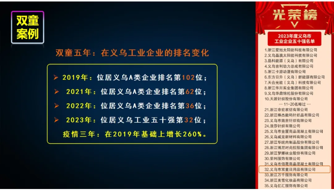 2023年,平台整體增長35.24%;平(píng)台稅收增長(zhǎng)23.30%,成功(gōng)登榜(bǎng)“納稅千萬元以上工業企業”和“義(yì)烏市(shì)工業企業五十強”!