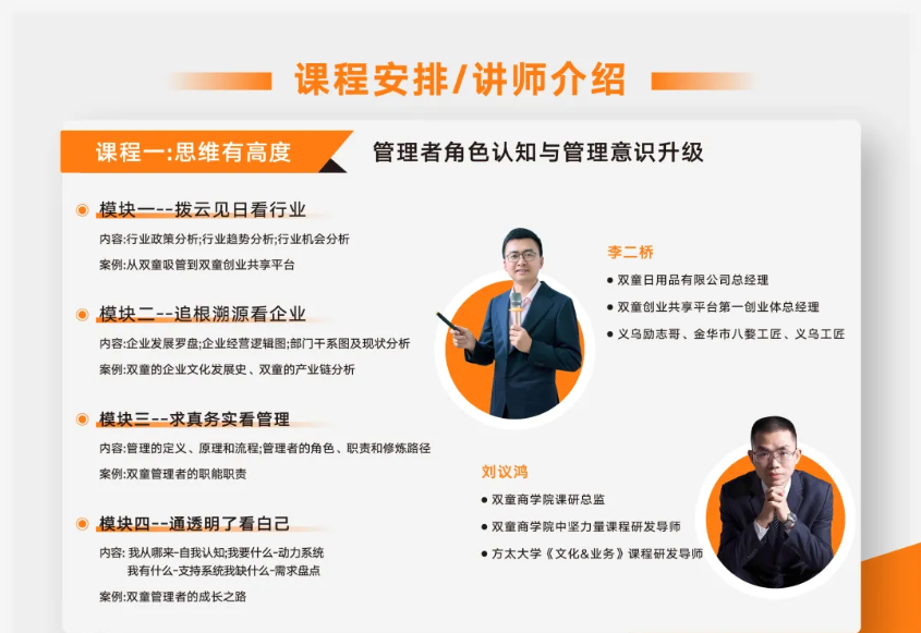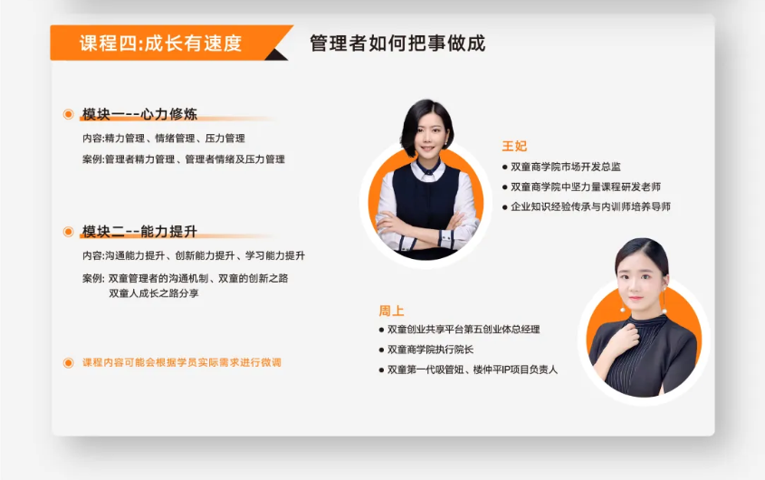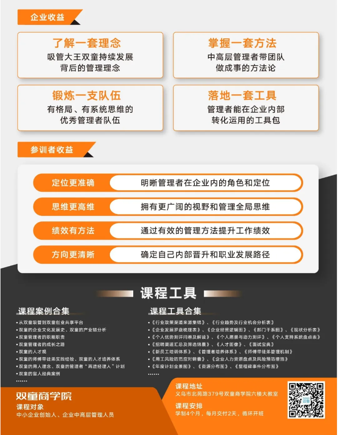 該課程學(xué)製為4個月,每月交付2天完成一個課程主(zhǔ)題學習,循(xún)環開班。為了不耽誤企業正常(cháng)運轉,更好安排中層管理集中學習,開課(kè)時間一般會安排在(zài)周六日(rì)。