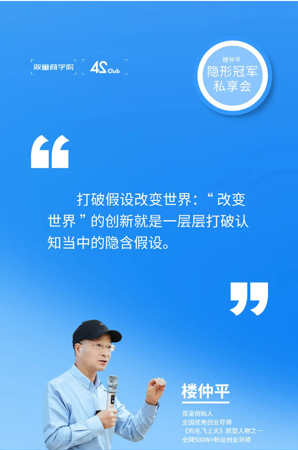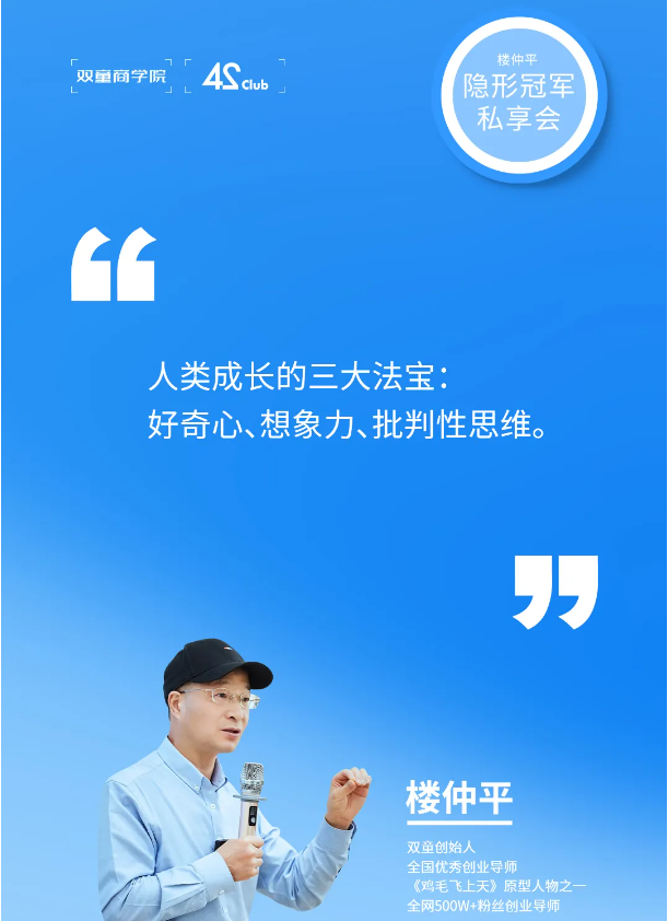 【樓仲平隱形(xíng)冠軍(jun1)私享會】是樓總(zǒng)唯(wéi)一(yī)一個(gè)全麵係統交付46年創業曆程的經驗總結和思維模型(xíng)的課程。全年6期課程,樓老師23天深度陪(péi)伴,從戰略(luè)到組織(zhī),從創新思維到企業家精神,幫助你的企業全方(fāng)位升級。