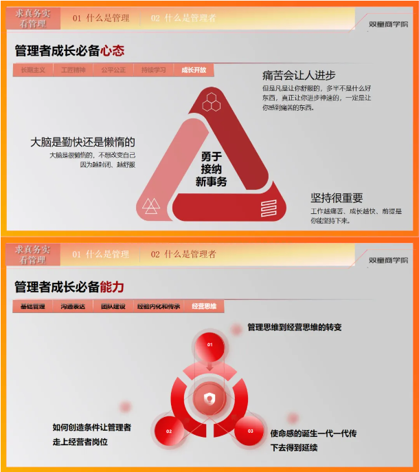 《中堅力量》全(quán)課程按照思維有高度、帶人有(yǒu)溫度、做事有力度、成(chéng)長(zhǎng)有速度四個(gè)主題分期交付,秉著實用主義的原則(zé),各位(wèi)老(lǎo)師在課程交付中,不僅拆解原理,還直接給工具、給(gěi)方法,以幫助參訓企業(yè)全方位(wèi)的提供管理者(zhě)綜合素養!