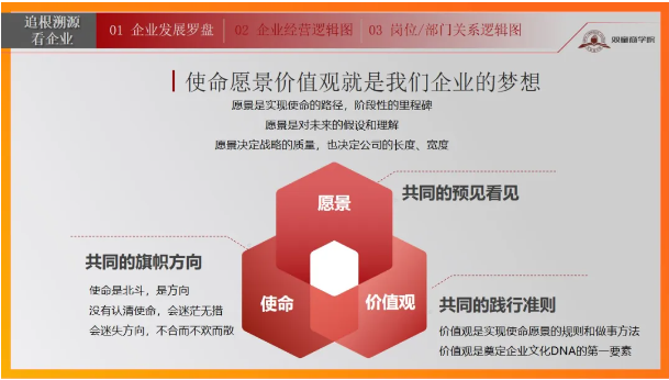 “追根溯源看企業”旨在讓參訓學員明確自己企業發(fā)展目標、夢想,並推動目標的實現;正確認知企業(yè)經營現狀,明確企業盈利的關鍵點(diǎn)和卡點;掌握科學合理地劃分部門與崗位的依據和方法。