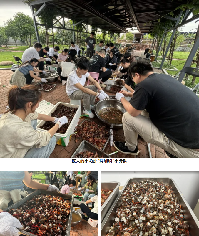 等到300斤小(xiǎo)龍蝦被運到空中花園時,所有的小夥伴都已經準備就(jiù)緒了,有專(zhuān)門(mén)去頭取蝦線的小分隊,小龍蝦(xiā)“洗刷(shuā)刷”小分隊、傳送小分隊和後廚配菜、掌(zhǎng)勺小分隊,大家分工明確,同步進行,配合相當(dāng)完(wán)美,就像平時在工作中一(yī)樣有默契,每一個步驟都不假人手,親自完成,滿滿參與感!