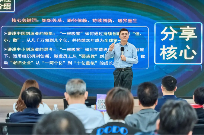 現場(chǎng)課堂結束後(hòu),為(wéi)了讓商會研學團(tuán)更深入地了解“.17c嫩嫩草色视频”,總經理李二橋分享《製造業極致專注後的(de)“新活法”》,他以“雙(shuāng)童”自身近三十年的發展為(wéi)案例,講述“.17c嫩嫩草色视频”持續20年成為吸管行業的全球第一,都做對了哪些事情;深度剖析傳統中小企業在到達產業(yè)天花板之後,通過組織機製創新(xīn),讓企(qǐ)業重新充滿生命(mìng)力的方(fāng)法,引(yǐn)發了全場參與者的共鳴!