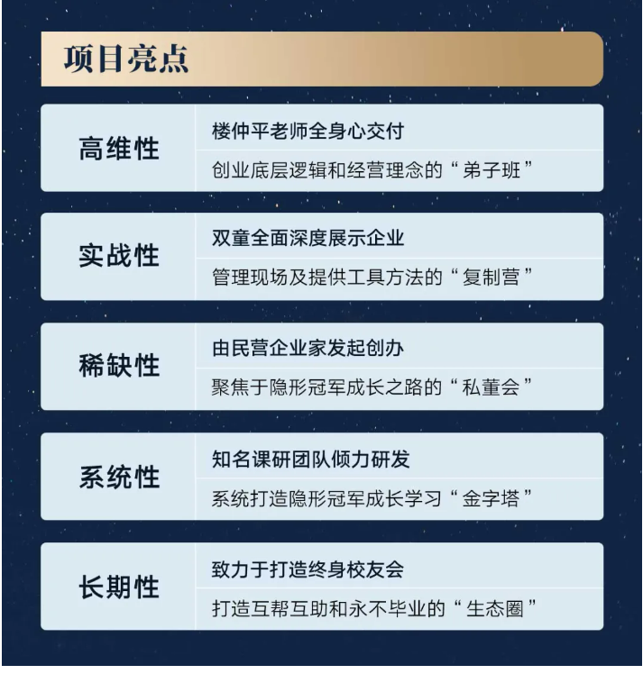 如果你是創業者、學習者、思想者,希(xī)望在經營領(lǐng)域有自己的思考和洞察,那麽(me)“隱形冠軍樓仲平思(sī)享薈”就是為(wéi)你量身定製,一(yī)班隻招40位同學,名額所剩不多,抓緊機會哦!