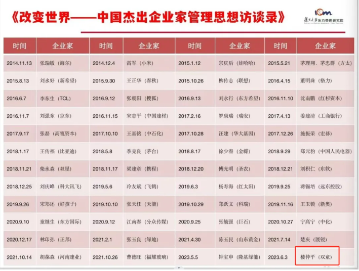 樓仲平(píng)老師在創業實踐中,持續(xù)近30年自學管理學、經濟學(xué)、哲學、自(zì)然科學、社會科學等眾多學科,形成並積(jī)累了深厚的哲科思想(xiǎng)、管理認知和實戰經驗,從一個挑貨郎擔的草根創業者成長為教育(yù)部認證的中國優秀創業導師,並被複旦大學東方管理研究(jiū)院收錄到《改變世界-中(zhōng)國傑出企業家(jiā)管(guǎn)理思想》的50位中國優秀企業家之一。