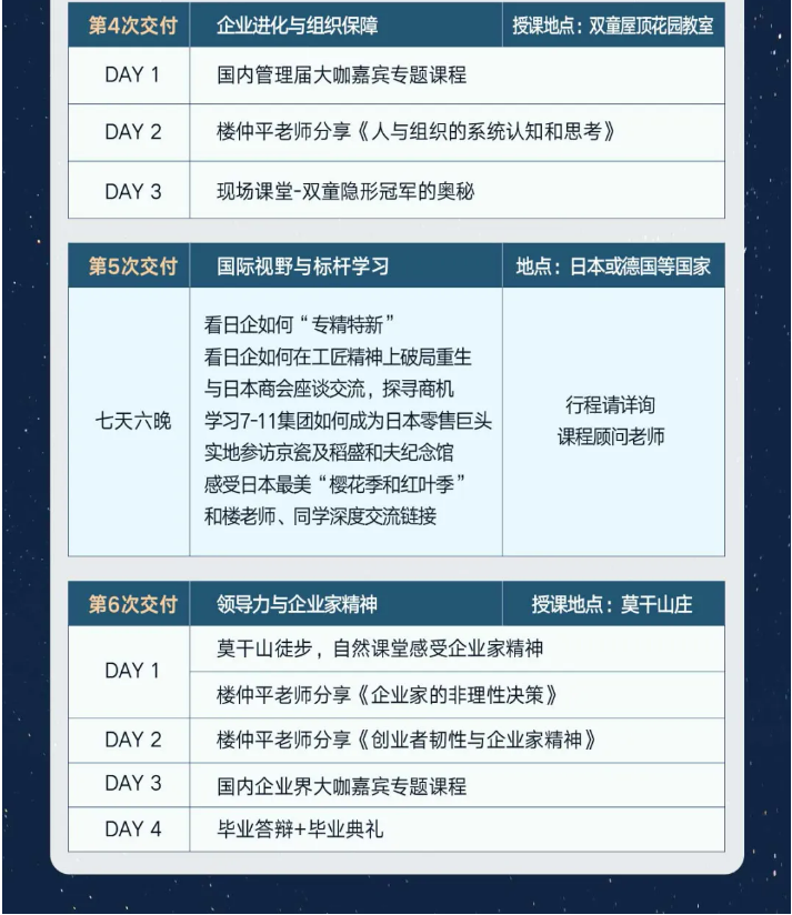 一(yī)年陪(péi)跑、7大模塊(kuài),樓老師將(jiāng)花費24天時間深度陪伴學員成(chéng)長,圍繞《打開創業者認(rèn)知之門》、《產(chǎn)品創新與認知迭代》、《戰略管理與錯位競爭》、《企業進化與組織保障(zhàng)》、《國際(jì)視野與標杆學習》、《領(lǐng)導力與企(qǐ)業家精神》等6大主題內容和同學們做深度地閉門分享。