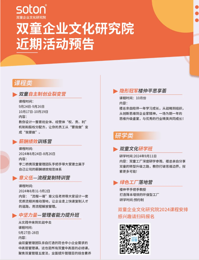 目前,該機製也被打磨成一套非(fēi)常成熟的、可複製、可落地的《自主(zhǔ)製創業裂變營》課程,完全契合中小微創業者的需求,賦能了超2000家(jiā)企業成長!好評反饋(kuì)不斷!