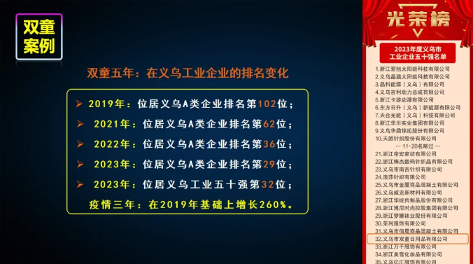 2023年,平台整(zhěng)體(tǐ)增長35.24%;平(píng)台稅收增長23.30%,成功登榜“納稅千萬元以上工業企業”和“義烏市工業企業五十強”!