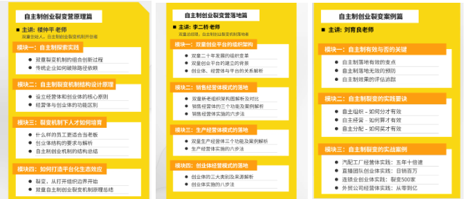 《自主(zhǔ)製創業裂(liè)變營》是一個超(chāo)實用主義的課程,采用理論+實踐+案例相結合的(de)方式,讓學員能夠(gòu)在3天2夜的學習中,能夠自主設計一(yī)套完整的落地方(fāng)案!