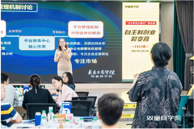 第(dì)七經營體體長張娟跟學員互動交(jiāo)流第十(shí)四創業體總經理蔣秀芳跟學(xué)員分享平台與創業體之間的財務處理問題第三創業體總經理孟竹燕與學(xué)員分(fèn)享創(chuàng)業體(tǐ)運營的(de)相關(guān)經驗