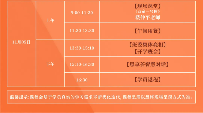 一年期(qī)的課(kè)程交付中,樓老師將花費24天時間深度陪伴學員成長,圍繞《開門·創業者成長》、《國際視野與標杆學(xué)習》、《產品創新與認知迭代》、《戰略管理與錯位競爭》、《企業進化(huà)與組織保障》、《領導力與(yǔ)企業家精神》等6大主題內容和同學們做(zuò)深度地閉門分享,並根(gēn)據不同課程主題,每期都會邀請飛行嘉賓參與課程(chéng)交(jiāo)付!