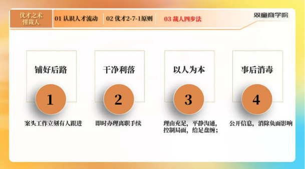 但是,程老師告訴大(dà)家一旦選擇優(yōu)才,必須要提前(qián)做好接頭工作,並且做好善後工作,消除負麵影響,具體的裁人步驟可分為:鋪好後路-幹淨利落-以人為本-事後消毒(dú),將消極影響降到最低!