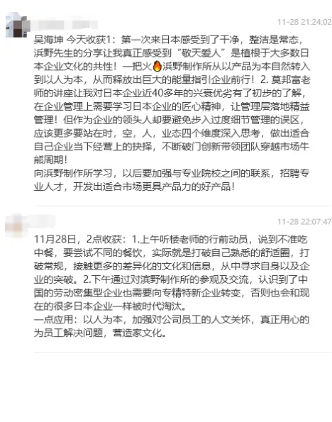 所以(yǐ),在第(dì)一天的研學結束之後,同學們不僅收獲了很多關於產品創新、精細化管理等企(qǐ)業經營的新(xīn)靈感,對(duì)自身企業未來(lái)的經營方向也有了不一樣的感觸: