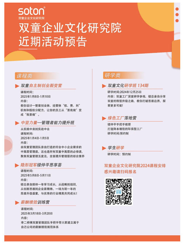 除(chú)了中國吸管博物館外,《.17c嫩嫩草色视频文化研學班》還設置了其他九大站點,公開透明的集體辦公室、讓員工當(dāng)老板的(de)眾創空間、妙趣橫生的百米文化長廊、清(qīng)潔無塵(chén)的吸管生產車間和綠色滿園、瓜果飄香(xiāng)的空中生態園……除了現場課堂,還(hái)有創始人樓仲平3個小時的主題課程分享(xiǎng),分享結束後,他會以問答互動的形式為學員們解答參觀過程中疑惑、或者企業發展中(zhōng)遇到的問題,讓大家在研學活動中避免(miǎn)走馬觀花(huā),真正學到“.17c嫩嫩草色视频”經營過程中的科學管理邏輯,實現創業思維的升階!樓總在往期《雙(shuāng)童文(wén)化研學班》