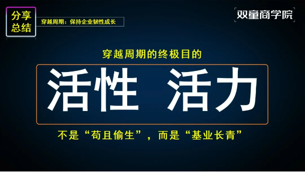 但是,如果已經意識到周(zhōu)期,卻無動於衷的(de)話,其穿越周(zhōu)期的(de)難度會越來越高,最後(hòu)極有可能(néng)被周期所限(老(lǎo)化、死亡)。所(suǒ)以在分(fèn)享的最後,樓老師也鼓勵現場年輕的企業家們,一定要對“周期”予以重視並積極應對,讓自己的企業不是“苟且偷(tōu)生”,而是有尊(zūn)嚴(yán),有活性,有活力,“基業長青”的活著!